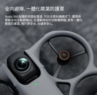 - 一體化槳葉保護罩:延續 Avata 系列的涵道式設計,具備極強的耐撞性,適合近距離靠近物體拍攝或在窄小空間穿梭。